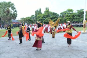 Sebanyak 80 pelajar SD, SMP, dan SMA juga turut berkolaboras menambah kekhidmatan suasana upacara di Halaman Kantor Bupati Sumenep.